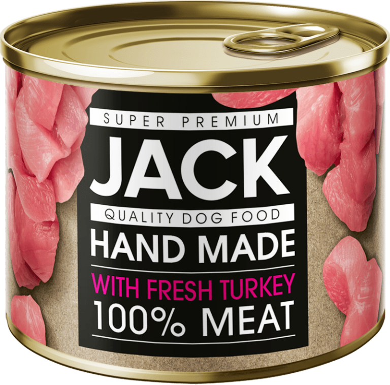 Jack Super Premium hrană completă cu curcan pentru câini, cu conținut 100% carne. Conține 50% carne de curcan, 25% carne de vită și 25% carne de porc. Hrană, fabricată manual, este gătită în sucul propriu pănă când carnea este fragedă și moale. O conservă de calitate superioară, ușor digerabilă. Datorită modului de preparare, își păstrează conținutul de vitamine și minerale.
